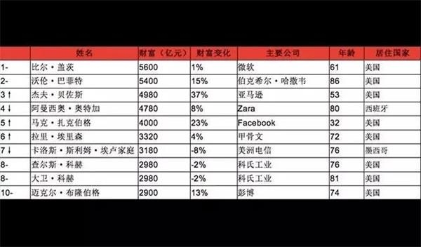 卡洛斯跌出前五,小扎首次进五。前五名中,比尔盖茨财富5600亿元蝉联世界首富,巴菲特排名第二,没有变化。53岁亚马逊创始人杰夫贝佐斯财富上涨37%,跃居第三,马克扎克伯格首次进入前五。墨西哥电信大亨卡洛斯斯利姆埃卢家庭财富3180亿元,较上年度缩水8%,排名第七。前十位中,有八名是美国人。
