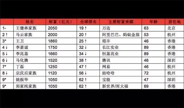 大中华区,63岁的王健林及其家族以2050亿元财富蝉联2017胡润全球富豪榜大中华地区首富,全球排名第19位,比去年上升2位;53岁的马云及其家族财富2000亿元位列大中华区第二,全球第20位,比去年上升16位;46岁的王卫因为顺丰成功借壳上市,迅速超越许多老牌企业家并直逼马云、王健林,财富达到1860亿元,位列大中华区第三,全球第25位,比去年上升305位。