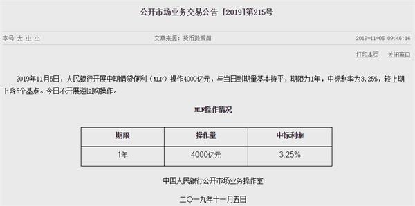 11月5日,央行发布公告称,当天开展中期借贷便利(MLF)操作4000亿元,与当日到期量基本持平,期限为1年,中标利率为3.25%,较上期下降5个基点。这是自2018年4月以来,首次调降1年期MLF利率。
