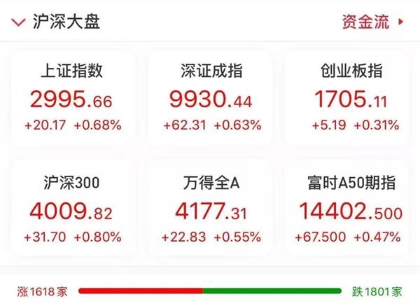 A股市场也全线上扬,截至午盘,沪指收涨0.68%,剑指3000点,深成指收涨0.63%,创业板指收涨0.31%。上证50创21个月新高,北向资金净流入近35亿元。