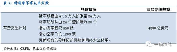 特朗普计划扩大军事支出,具体内容包括扩张海陆空军规模及增购舰只、航空器等。按CRFB测算,这部分政策估计将造成美国10年期总共增加支出4500亿美元。