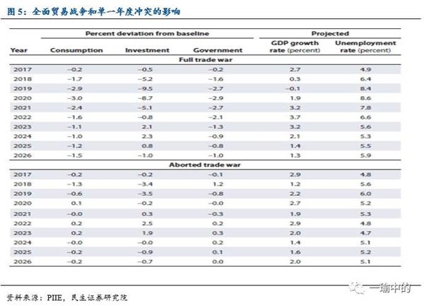 具体而言:假设美国和墨西哥及中国爆发贸易战争,若该项政策10年不变,将使得消费、投资、政府支出、GDP增速、视野率出现显著偏离,消费和政府支出最多单一年度下降可达3个百分点,投资在2020年被预测可能下滑9.5个百分点,GDP增速有可能在2019年出现负增长,失业率也将显著提高。若该项政策只持续一年,虽然影响程度和持续时间有所下降,但消费、投资、政府支出、GDP增速、失业率仍会出现负向偏离。