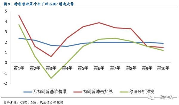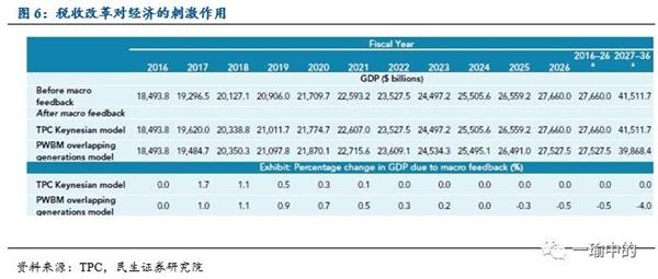 TPC(税收政策中心)分析了特朗普税改政策对GDP的影响,总体而言特朗普的税收计划仅在短期内对经济产生影响,2017-2021年的GDP增速将会分别提高1.7%、1.1%、0.5%、0.3、0.1个百分点,但其后又会回落到先前水平,即中长期不影响经济。