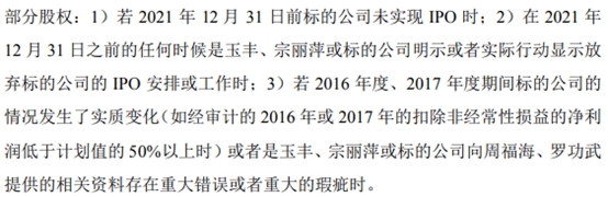 第二次发生在2016年10月,派克新材实控人与新股东周福海和罗功武签订对赌协议。该协议约定触发股份回购的情形也是三种,不过具体内容有所不同。一是,派克新材在2021年12月31日前未能IPO;二是,派克新材在2021年12月31日前明示或者实际行动放弃IPO;三是,派克新材2016年和2017年扣非后归母净利润低于计划值的50%以上,或提供的数据存在重大错误或者重大的瑕疵。