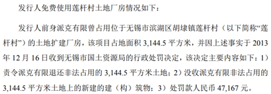 在更新后的申报稿中,派克新材“坦白”,公司曾占用该地块扩建厂房,并因上述事实于2013年12月16日收到无锡市国土资源局的行政处罚决定。派克新材除被责令退还该土地外,该地块上建筑物也被没收,还被罚款4.72万元。