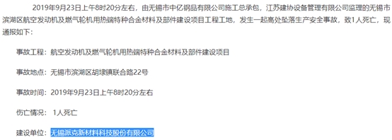 对此,派克新材于申报稿中表示,经调查,公司不存在违法违规事项,该项目施工总承包单位无锡市中亿钢品有限公司(下称“中亿钢品”)已被责令做好死者的善后工作。