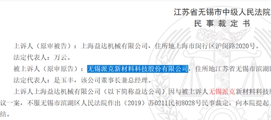 2019年10月25日,派克新材向无锡市滨湖区人民法院提起诉讼,要求上海益达机械有限公司(下称“益达机械”)立即支付货款及相应利息损失并返还质保金。同时,派克新材向法院提起诉讼(诉前)保全,2019年10月31日,益达机械银行账户存款2500万元已被冻结。
