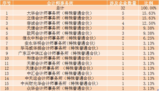 会计师事务所方面,32家受理企业共涉及会所16家,服务企业数量前三的会所分别是大华会计师事务所(特殊普通合伙)、立信会计师事务所(特殊普通合伙)、容诚会计师事务所(特殊普通合伙),受理数量分别为5家、5家、4家。