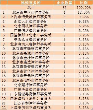 律师事务所方面,共有22家律所参与上述首批创业板企业的IPO。其中,北京市中伦律师事务所、上海市锦天城律师事务所、浙江天册律师事务所为受理企业数量前三名。