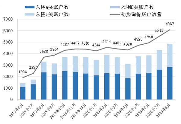 2019年首批25家科创板网下询价平均参与账户数为2157个,至2020年8月,科创板网下询价平均参与账户数达6087个,较2019年12月上升38.63%。