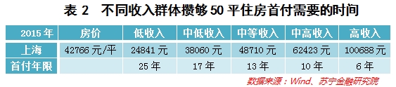 假设现在想按2015年底的房价购买50平的住房,如果首付比例是30%,那么首付需要64万元(42766元/平×50平×30%)。然后,拿64万元除以不同收入群体的人均可支配收入,可以得到这个群体攒够首付需要的年限,比如高收入群体按10万元的年可支配收入总额,攒够64万元首付大约需要6年的时间(参见表2).