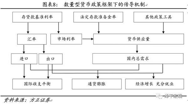 在传统的数量型货币政策框架之下,央行通过法定存款准备金率调节基础货币规模,通过存贷款利率调节商业银行的信用扩张行为,此外辅之以存贷比考核、窗口指导等具有行政色彩的手段,实现对于货币供应量的管控,进而影响实体经济变量。另外一方面,在2005年“汇改”之后,伴随着人民币汇率形成机制的不断市场化,利率的调整也会通过汇率渠道对实体经济变量产生一定影响。