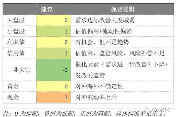 3)低配除黄金之外的商品,因为需求边际改善的力度减弱对商品进一步上涨的催化力度不足;继续低配小盘股和信用债,仍然是基于流动性对估值的影响。