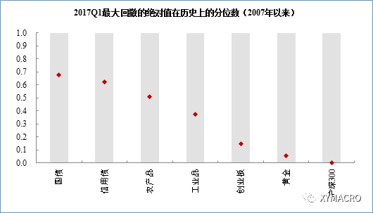 1季度确定性创造低波动。正如我们在上一期资产配置报告《盈利向上,估值向下》中阐述的,1季度经济基本面稳定的确定性较高,这造就了1季度风险资产在低波动中上涨。从季度的最大回撤来看,大盘股(沪深300)创下了2007年以来最低的季度最大回撤,工业品的最大回撤也处于中位数以下。在这种相对的确定性下,无论从横向来看,还是纵向来看,风险资产的Sharpe比都较高。