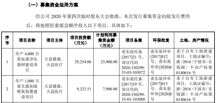 其次,根据招股书披露,天益医疗本次上市的募投项目主要包括“年产4000万套血液净化器材建设项目”和“年产1000万套无菌加湿吸氧装置建设项目”等,其中“年产1000万套无菌加湿吸氧装置建设项目”涉及计划利用募集资金额仅为7900万元。上述两个项目获得项目备案、环保批复均是在2017年,相关项目所需土地也均于2016年获得。