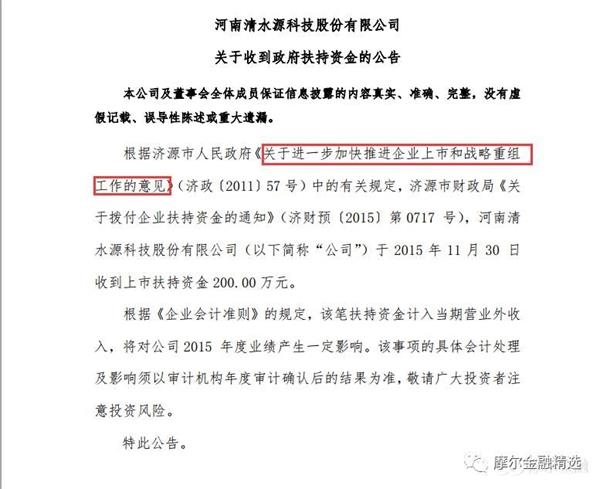 当然我不是说发了这样公告的上市公司它就一定会进行重组,只是如果大家能重视这些蛛丝马迹,就能增加我们寻找到重组股的概率,也能增加我们对标的认识,在逻辑上也说的过去。例如,清水源在2015年12月1日发布了一则公告,如下图