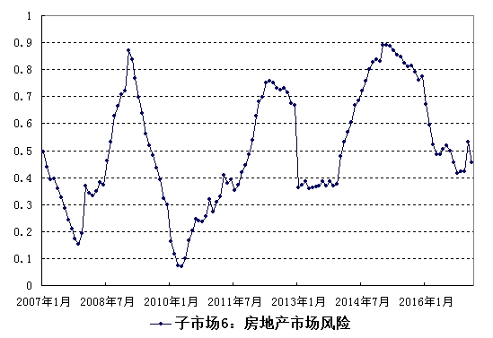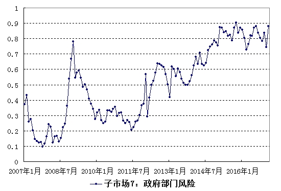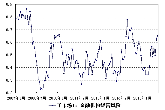 二、各子市场金融风险指数:金融机构经营风险和政府部门风险指数居于高位,股票市场和外汇市场金融风险指数平稳,债券市场风险指数居于低位,货币市场风险指数高位回落,房地产市场风险指数中位稳定。