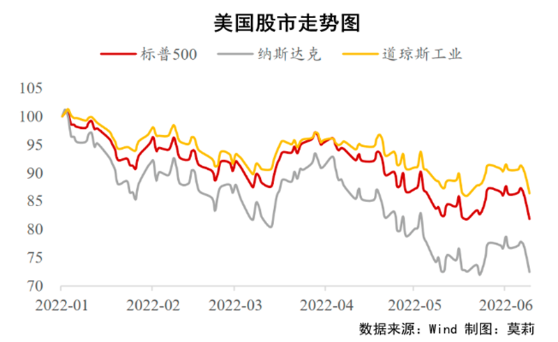 自2008年以来,美股在宽货币和低利率环境下大幅上涨;即便在新冠疫情恶化的2020年和2021年,受益于美国政府大额财政刺激计划和美联储无限量货币宽松,美股也仍然“牛气”十足。然而,2022年以来,美股“牛市”颓迹明显——美国股市出现了较大幅度的下跌调整:从年初至今,除3月份出现过小幅反弹外,基本上是单边下跌走势,4月份以后,更进入了加速下跌阶段。虽然5月下旬美股出现反弹,但上周美股再度重挫,6月13日更是直接遭遇“黑色星期一”。