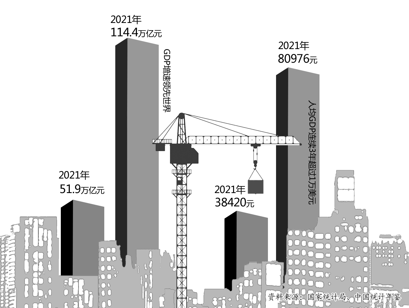 一是续写经济稳定发展的奇迹。2021年,我国国内生产总值(GDP)达到了114万亿元,占全球经济的比重由2012年的11.4%上升到18%以上,将近五分之一。中国作为世界第二大经济体的地位得到巩固提升,人均GDP达到了1.25万美元,向着高收入国家稳步迈进。