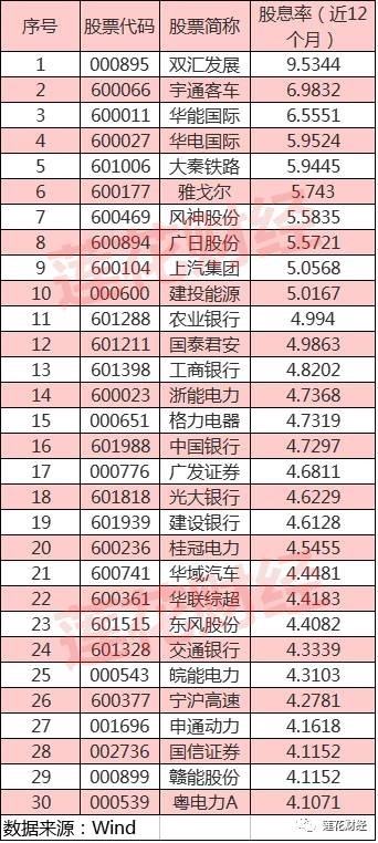从近12个月股息率排名靠前的公司来看,双汇发展近12个月的股息率达到9.53%,位列榜首;宇通客车近12个月股息率亦高达6.98%。此外,华能国际、华电国际、大秦铁路、雅戈尔、风神股份、广日股份、上汽集团、建投能源的股息率均超过5%。