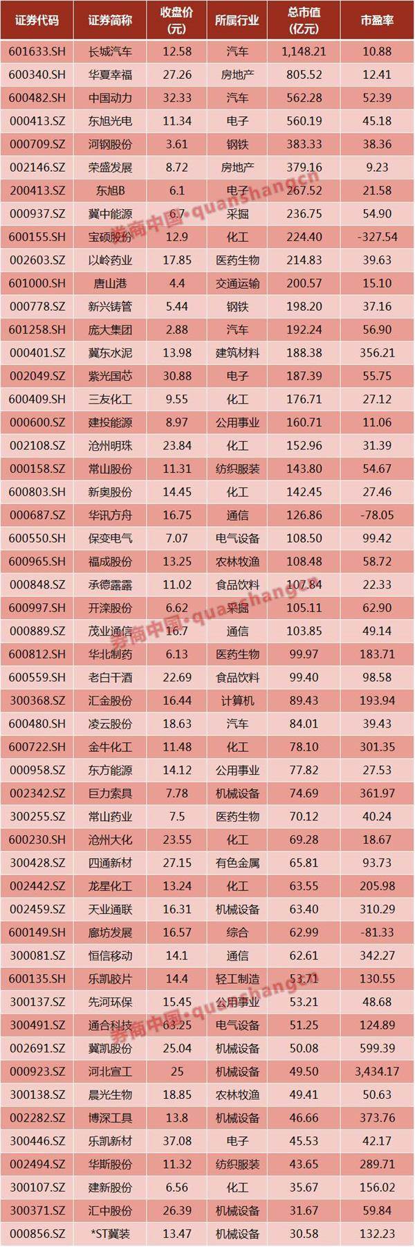 统计数据显示,河北本地股共有52只,市值排名前五的分别是长城汽车、华夏幸福、中国动力、东旭光电、河钢股份。而市值不足100亿元的个股多达26只,这些小盘股在香港没有标的,也许在爱炒小盘的A股市场,表现会更好。