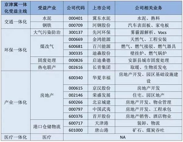 3)基建类:京津冀地区中涉及“钢铁、水泥、工程机械、港口、高速公路”等行业上市公司(剔除重合于前面1、2点的上市公司)有望受益。依次推荐:冀东水泥、金隅股份、河钢股份、新兴铸管、首钢股份、河北宣工、唐山港、天业通联、三一重工、天津港、华北高速等;