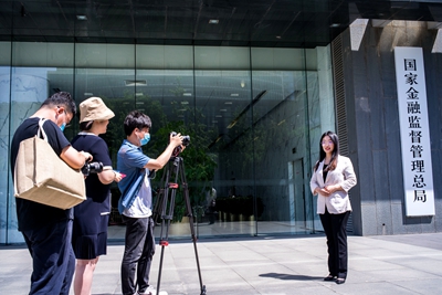 5月18日上午,《金融时报》记者在国家金融监督管理总局揭牌仪式现场进行采访报道。 本报记者 刘志良 摄