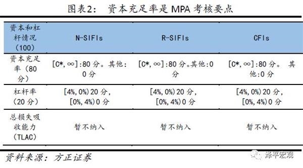 MPA,宏观审慎评估体系,即央行在季末借助在MPA评价体系对广义信贷类资产进行考察,通过设定一定的阈值范围评价并规范银行行为.在七大考核方面中,资本充足率和杠杆率是其首要指标,其中用以考核银行风险程度的资本充足率占据重要位置,也是最难完成的指标。资产负债情况中,大行压力不大,小行需要注意。考核流动性方面要求相对刚性,LCR是关键,会对市场的流动性造成一定的压力。资产质量方面分为不良贷款率和拨备覆盖率,指标要求相对非刚性,允许中间过渡,压力不大。定价行为、外债风险、信贷政策执行三个方面影响相对较小。资本与杠杆情况、定价行为中任意一项不达标;或其他五项“资产负债情况、流动性、资产质量、外债风险、信贷政策执行中”任意两项及以上不达标,就会归入C档机构,给予适当约束。