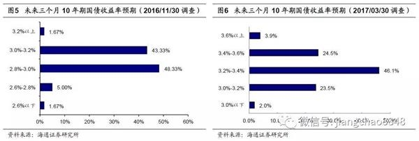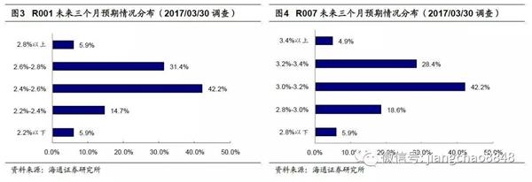 资金面预期仍偏紧。17年一季度货币政策持续偏紧,货币市场利率中枢明显上行。调查结果显示,投资者预期资金利率仍将在高位:约42%的受访者认为未来三个月R001中枢将在2.4%-2.6%;接近31%的受访者认为其会进一步抬升至2.6%-2.8%。42%的受访者认为R007将在3.0%-3.2%之间波动;28%的受访者认为R007会进一步抬升至3.2%-3.4%。