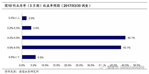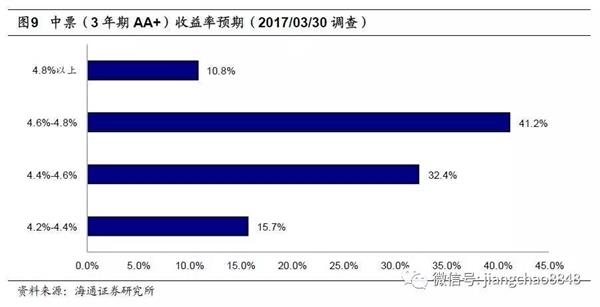 16年年末信用债跟随利率债剧烈调整,一季度信用债收益率仍在逐步抬升。本期调查时3年期AA+中票收益率已经接近4.6%,较1月初上行了40BP左右。