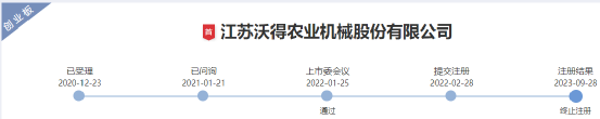 根据深交所官网,已经走到注册阶段的沃得农机,在证监会审阅注册申请文件过程中,公司保荐机构海通证券提交了撤回申请,主动要求撤回注册申请文件,证监会根据相关规定,决定终止公司发行注册程序。