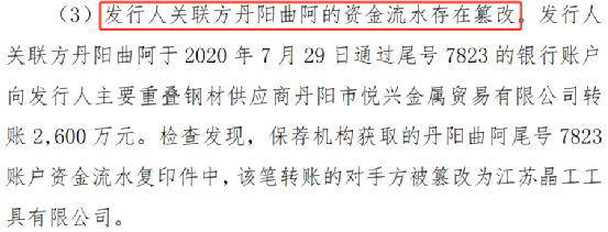 此外,沃得农机关联方丹阳曲阿财务管理顾问有限公司于2020年7月29日通过尾号7823的银行账户向发行人主要重叠钢材供应商丹阳市悦兴金属贸易有限公司转账2600万元。检查发现,保荐机构获取的丹阳曲阿尾号7823账户资金流水复印件中,该笔转账的对手方被篡改为江苏晶工工具有限公司。
