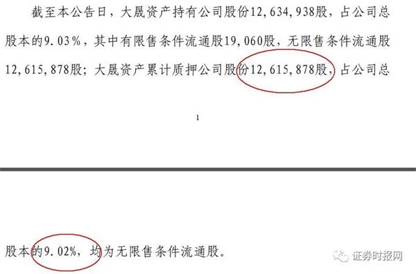 也即是说,截至2017年4月10日,该公司控股股东周镇科累计质押公司股份总数为5515万股,占其所持有公司股份总数比例为98.75%,占公司总股本比例为39.43%。大晟资产累计质押公司股份12615878股,占总股本的9.02%,二者合计占公司总股本的48.45%。