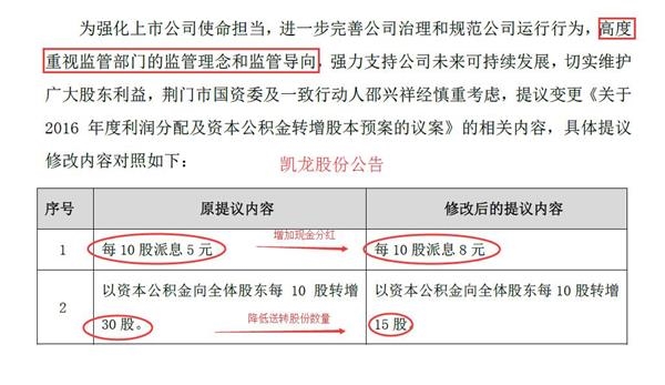 值得注意的是,在刘士余大批10转30高送转等投机现象、鼓励现金分红后,今晚就有凯龙股份积极响应号召,将此前公告的“10转30派5元”送转方案改为“10转15派8元”。