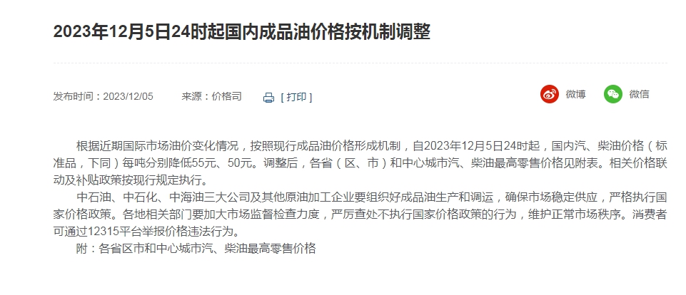中新经纬12月5日电 国内成品油价格“五连跌”。据国家发改委网站消息,根据近期国际市场油价变化情况,按照现行成品油价格形成机制,自2023年12月5日24时起,国内汽、柴油价格(标准品,下同)每吨分别降低55元、50元。