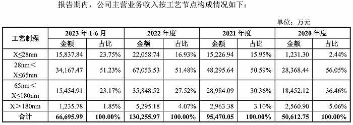 界面新闻注意到,按照工艺节点构成看,灿芯股份的主打工艺制程为28nm< X≤65nm,收入占比多年来保持5成以上,而工艺制程为65nm< X≤180nm以及X>180nm的收入占比则在逐年下降中,而逐渐递增的收入则来自X≤28nm工艺制程。2020年时金额1231.3万元,占比2.44%,到了2023年上半年金额1.58亿元,占比23.75%。
