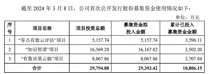 而原规划的三个募投项目中,“零点有数云评估”项目拟使用募集资金5157.74万元,实际投入募集资金3596.11万元,该项目已于今年2月宣布结项,项目节余募集资金被用于永久补充流动资金;“知识智谱”项目、“有数决策云脑”项目拟分别使用募集资金1.62亿元、8067.86万元,截至2024年3月8日,这两个项目已投入募集资金3502.2万元、3707.84万元,投资进度约22%、46%。