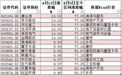 自4月5日雄安新区概念股启动首日演绎至今,上述14家个股中有11只个股的累计涨幅超过77%。其中,巨力索具、冀东水泥、中化岩土、先河环保、京汉股份均连续六日一字涨停;保变电气、渤海股份、河北宣工同样连续六日涨停。