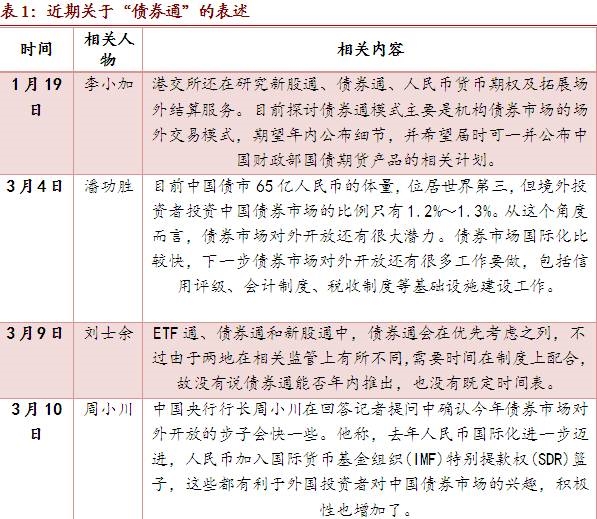 “债券通”将进一步提速债市开放。近两年来债市对外开放政策已取得较大突破;国际三大主流债券指数已对纳入在岸人民币债券释放积极信号;包括离岸国债期货上市、开放在岸外汇衍生品市场在内的各项措施,使得风险管理工具不断丰富;人民币汇率与贬值预期有望企稳。