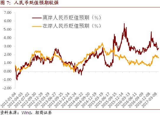 第六,无论是在在岸还是离岸中,人民币贬值预期均较强。