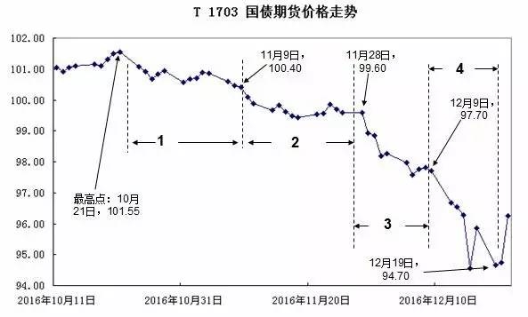 以T1703国债期货变化为例,其年内最高点在10月21日达到(101.55元),其后展开下跌,大致可以划分为四个阶段: