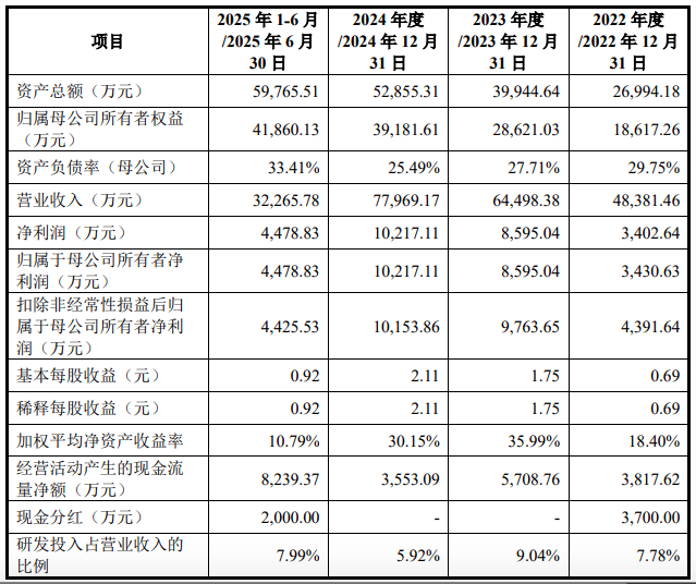 业绩方面,2022年至2024年及2025年1-6月(下称“报告期”),九安智能的营业收入分别为48,381.46万元、64,498.38万元、77,969.17万元和32,265.78万元,归属于母公司股东的净利润分别为3,430.63万元、8,595.04万元、10,217.11万元和4,478.83万元,经营业绩保持上升趋势。