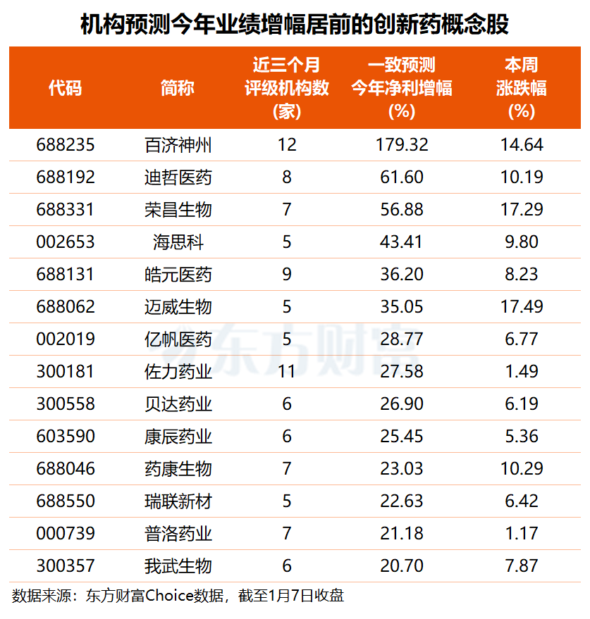 从未来增长潜力来看,根据5家以上机构一致预测,2026年有望实现净利增长的创新药概念股共30只,其中14股同比增幅或超20%。机构预计,百济神州今年净利有望同比大增1.8倍,迪哲医药、荣昌生物、海思科净利增速有望分别达62%、57%和43%,皓元医药、迈威生物一致预测净利增幅均在三成以上。