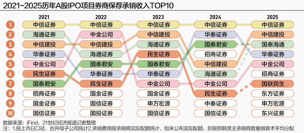 2021~2025年,A股IPO保荐承销费用收入的第二名分别是海通证券、中金公司中信建投华泰证券中信建投