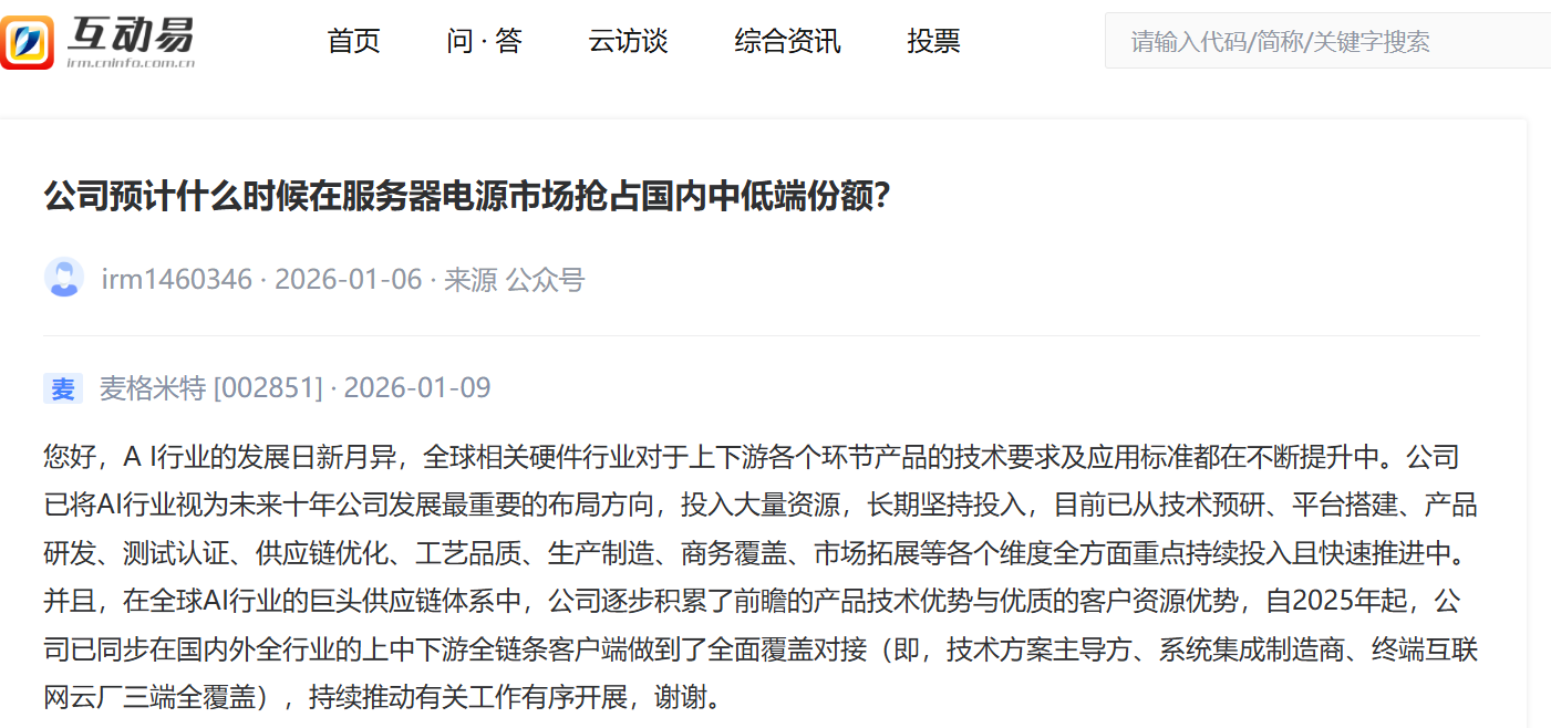 “互动易”平台显示,2026年1月9日,针对有投资者“公司预计什么时候在服务器电源市场抢占国内中低端份额?”的提问,麦格米特回应称,AI行业的发展日新月异,全球相关硬件行业对于上下游各个环节产品的技术要求及应用标准都在不断提升中。公司已将AI行业视为未来十年公司发展最重要的布局方向,投入大量资源,长期坚持投入,目前已从技术预研、平台搭建、产品研发、测试认证、供应链优化、工艺品质、生产制造、商务覆盖、市场拓展等各个维度全方面重点持续投入且快速推进中。并且,在全球AI行业的巨头供应链体系中,公司逐步积累了前瞻的产品技术优势与优质的客户资源优势,自2025年起,公司已同步在国内外全行业的上中下游全链条客户端做到了全面覆盖对接(即,技术方案主导方、系统集成制造商、终端互联网云厂三端全覆盖),持续推动有关工作有序开展。