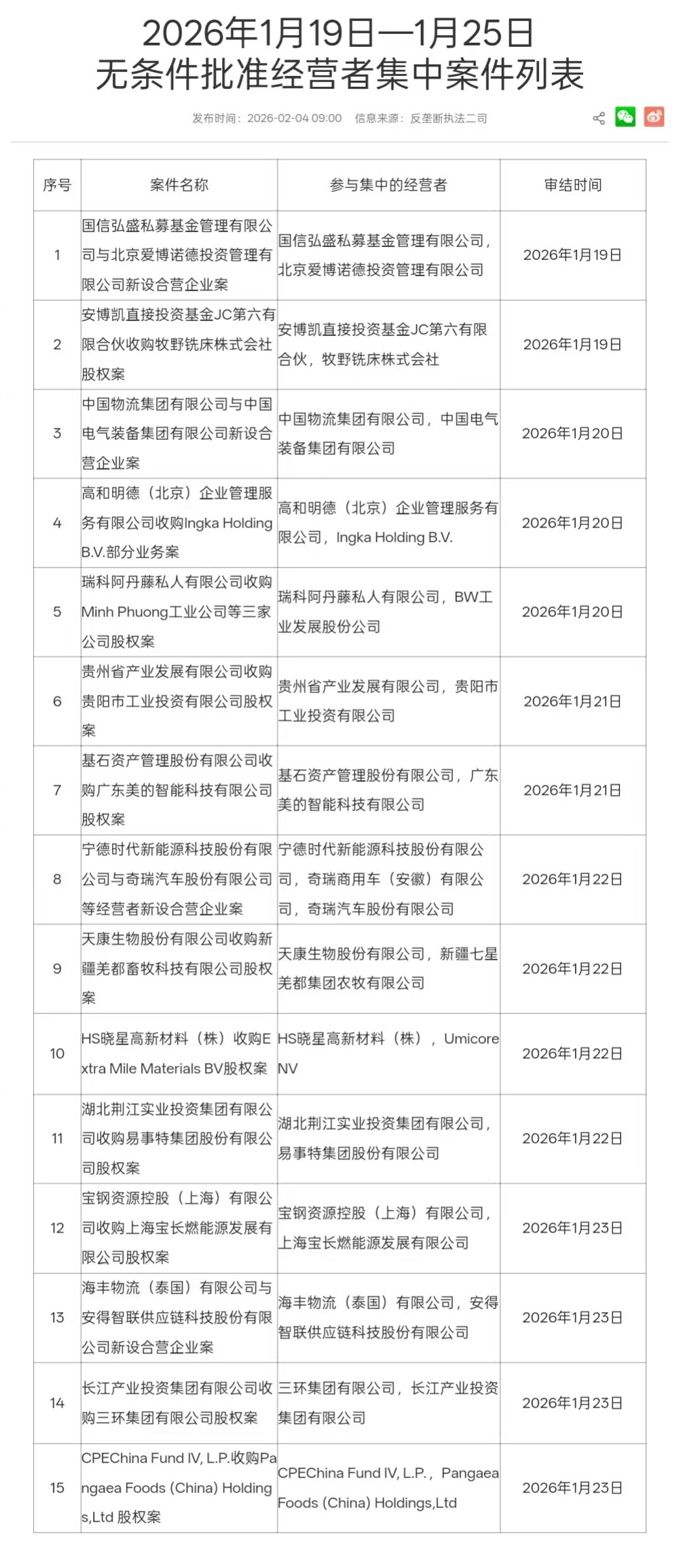 市场监管总局发布2026年1月19日—1月25日无条件批准经营者集中案件列表,其中包括宁德时代新能源科技股份有限公司与奇瑞汽车股份有限公司等经营者新设合营企业案。