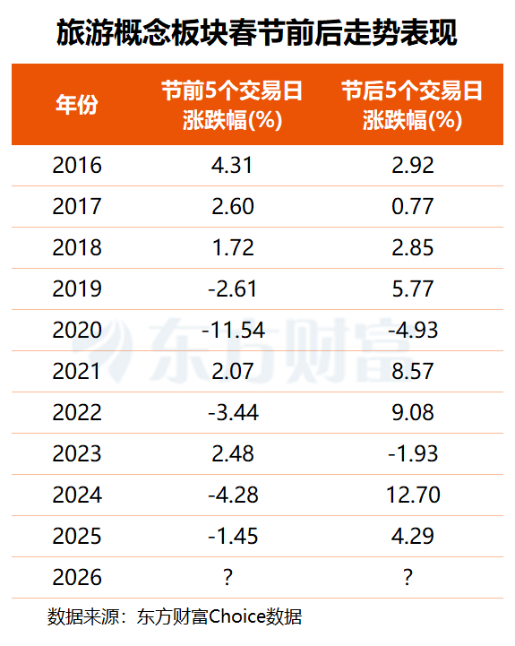 综合近十年旅游概念板块春节前后的走势来看,板块节前5个交易日涨跌互现,平均下跌1.01%,节后则大概率反弹,平均涨幅达4.01%。