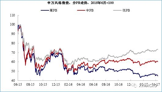 市场风格:已经转向基本面驱动。去年中期以来,资本市场的结构性特征值得重视。2015年6月股市下跌至2016年中期之前,市场的分化是不明显的。但是自2016年中期以来,市场则开始出现明显的分化,整体来看,是上证50>沪深300>中小板>创业板。换句话说,从市值大小来看,大市值股票要跑赢小市值。如果以估值水平来看,低PB的股票有明显的超额收益,中PB的股票基本持平,而高PB的股票仍在下跌。总结一下,当前市场的思路非常明显,即价值投资,基本面是股价的核心驱动因素。