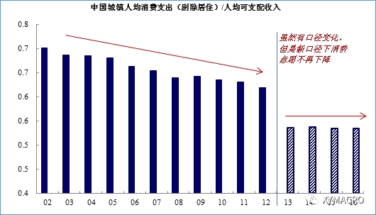 最直接的影响:储蓄率下降。本质上来说,中国当前处于经济的转型期,过去几年居民收入的整体增速实际上是在下降的。但经过过去的积累,居民开始觉得自己“并不穷”,也就是前述Ray Dalio所说的第三个阶段。所以我们看到2013年之后中国城镇居民整体的消费意愿不再下滑。所以,收入增速下滑,消费意愿提升,必然导致中国整体的储蓄率将是下降的。