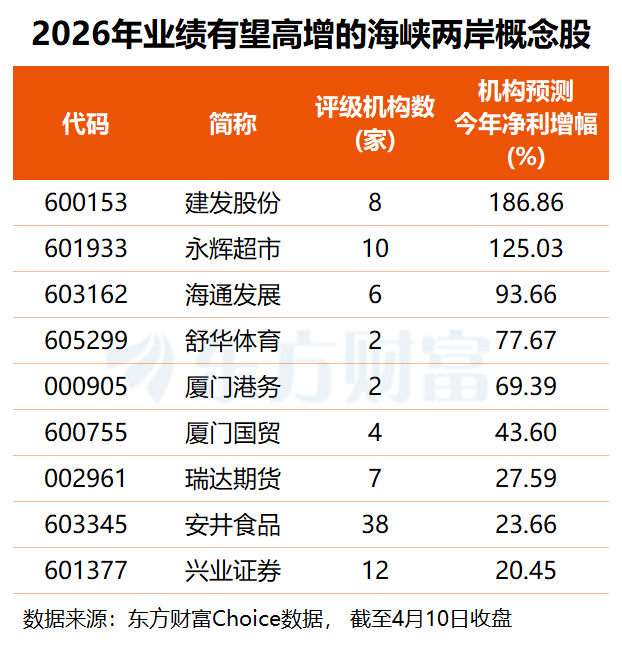 未来增长潜力方面,根据2家及以上机构预测,共有9只海峡两岸概念股2026年有望实现20%以上业绩增长,其中,机构预测建发股份今年净利或同比大增近1.9倍,永辉超市业绩将大幅改善,海通发展、舒华体育、厦门港务预测净利增幅分别达69%、78%和94%。
